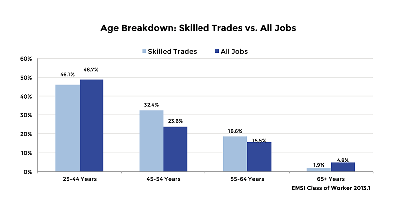 What makes this issue more striking is that the skilled trades have far fewer 65-and-older workers than the total labor force (1.9 percent to 4.8 percent) – a clear sign that these jobs are more physically demanding than the typical job. So unlike other occupations, many skilled trades workers can’t hold off on retirement because they need the money or simply enjoy working.