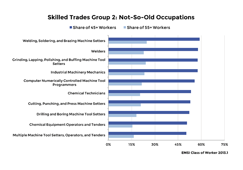 Group 2, the not-so-old skilled trades, includes a host of production occupations such as welders and industrial machinery mechanics. These are occupations with workforces slightly younger than those in Group 1, but impending retirements could still be a concern – particularly for welding, soldering, and brazing machine setters (59 percent of workers at least 45) and welders (58 percent).