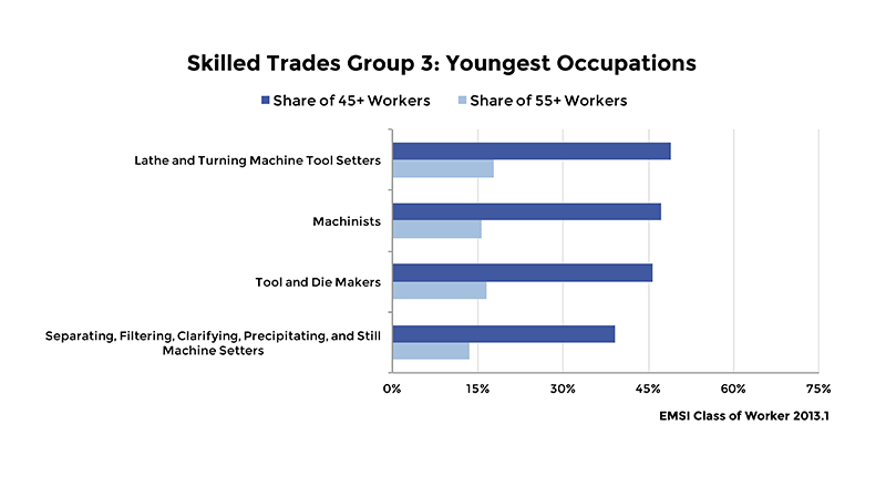 Lastly, we’ve grouped the youngest of all the skilled trades. Group 3 includes machinists, the second-largest of all skilled trades (394,523 estimated jobs in 2012).